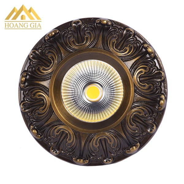 Đây là mẫu đèn âm trần cổ điển Standard với thiết kế hoa văn chạm khắc bằng đồng. Màu sắc chính của mẫu đèn downligth này là đồng vàng, đồng cổ. Bởi vậy nó cực kỳ hợp với những không gian có thiết kế tân cổ điển hoặc cổ điển. Mẫu đèn này có công suất là 10w, sử dụng chip led COB của hãng Citizen có nguồn gốc từ Nhật Bản cho hiệu suất chiếu sáng cao. Tuổi thọ bền bỉ trên 10 năm.