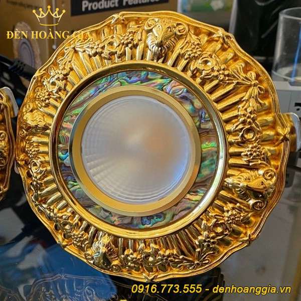- Mẫu đèn âm trần cổ điển mạ vàng 24K số 1: có chóa đèn khảm ngọc trai, họa tiết linh dương