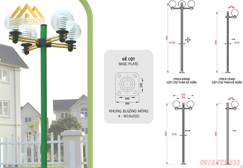 • Lắp đặt cột đèn theo nhiều kiểu, 1 bóng, 2 bóng chùm, 4 bóng chùm.